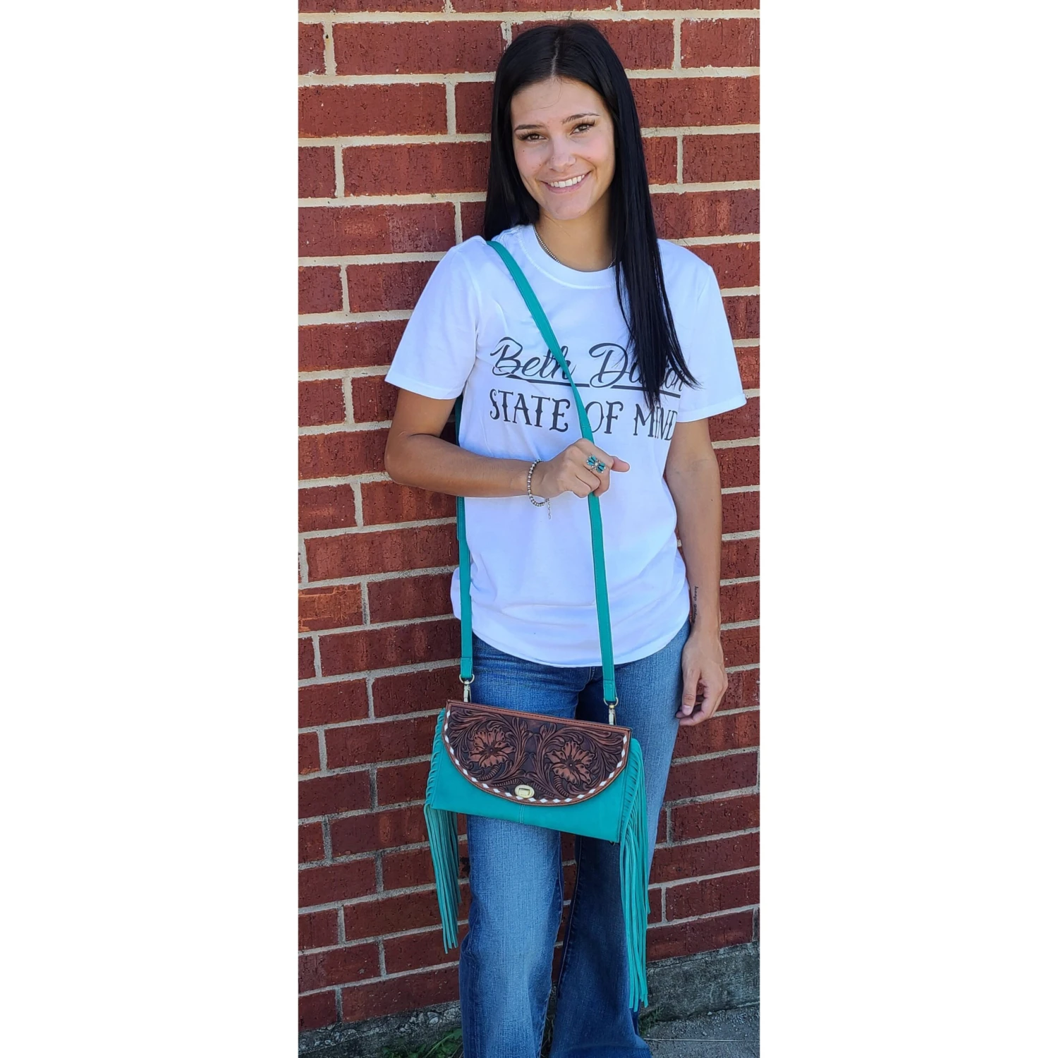 Where are my turquoise gals at? You can spice up things up and carry this as a clutch or you can add the straps and wear it as a crossbody. This is the perfect purse to dress up or down with.