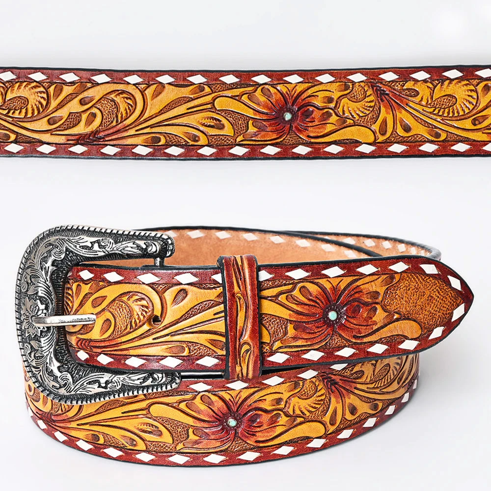 Look at this beautiful American Darling Belt! It is a floral tooled leather with yellow & burnt orange and white buckstitch.