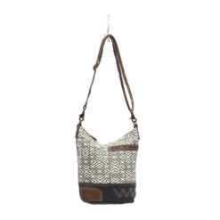 This denim like cross body purse features a blue and white Aztec design on front. The cross body strap is adjustable and the bag is big enough to hold all your essentials plus more!