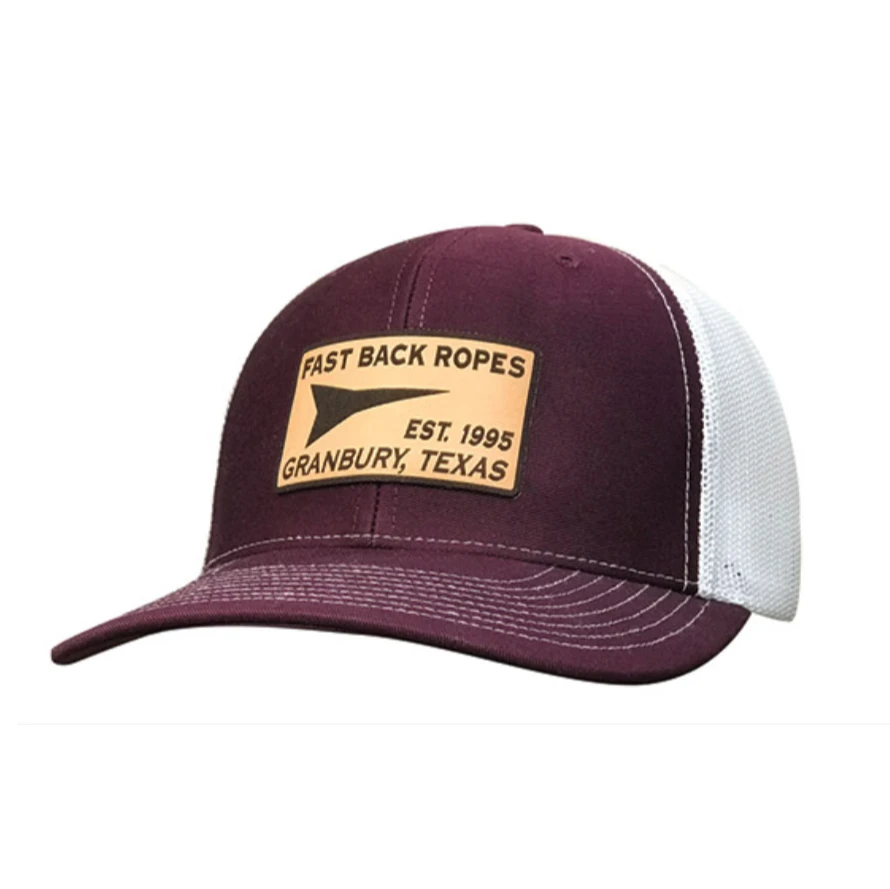 This Maroon cap with White mesh back from Fast Back features a leather Fast Back logo patch on the front.