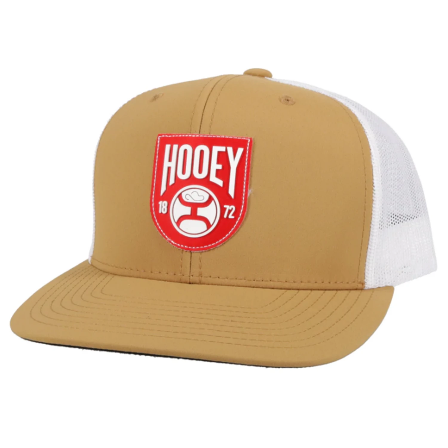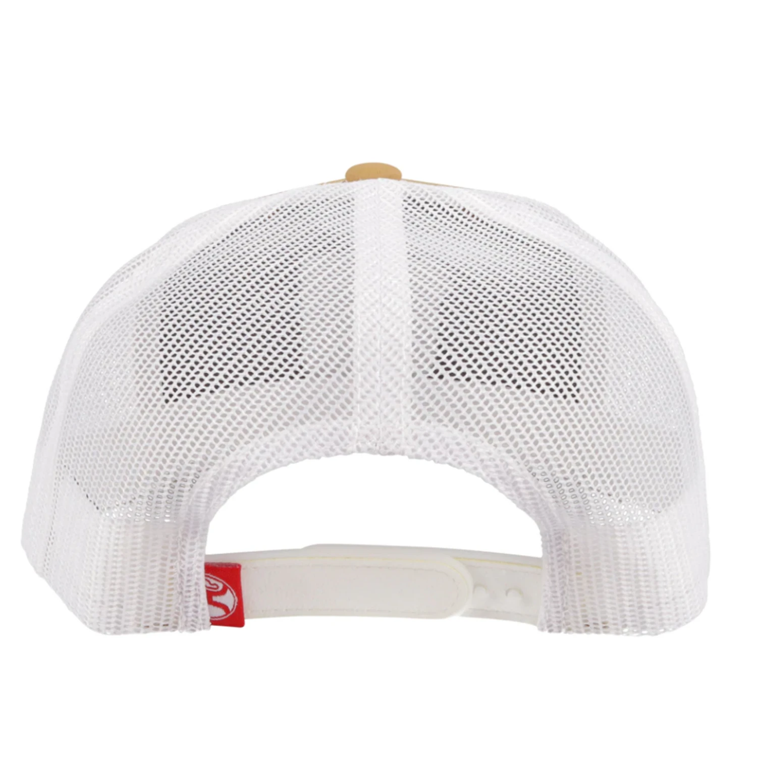 This work tan and white cap is available in a high-profile 6-panel version with a Hybrid bill. The front is made of an Odessa Fabric which helps prevent sweat rings and moisture. The back is white mesh for ventilation. OSFA adjustable backstrap with a red/white Hooey tag. The front patch is a red/white 1972 Hooey.