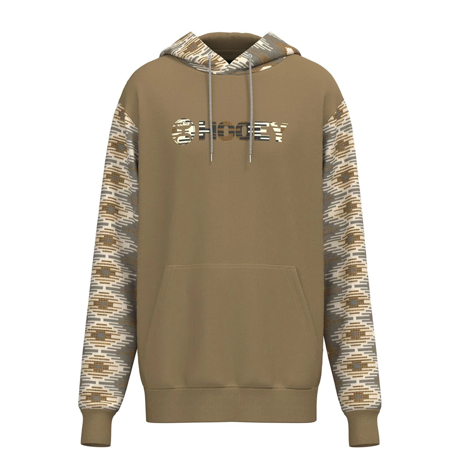 This tan with aztec sleeves hoodie has a Signature Soft Feel. The hood is double lined. Reinforced cuffs and waistband for wear along with a strengthened kangaroo pocket.