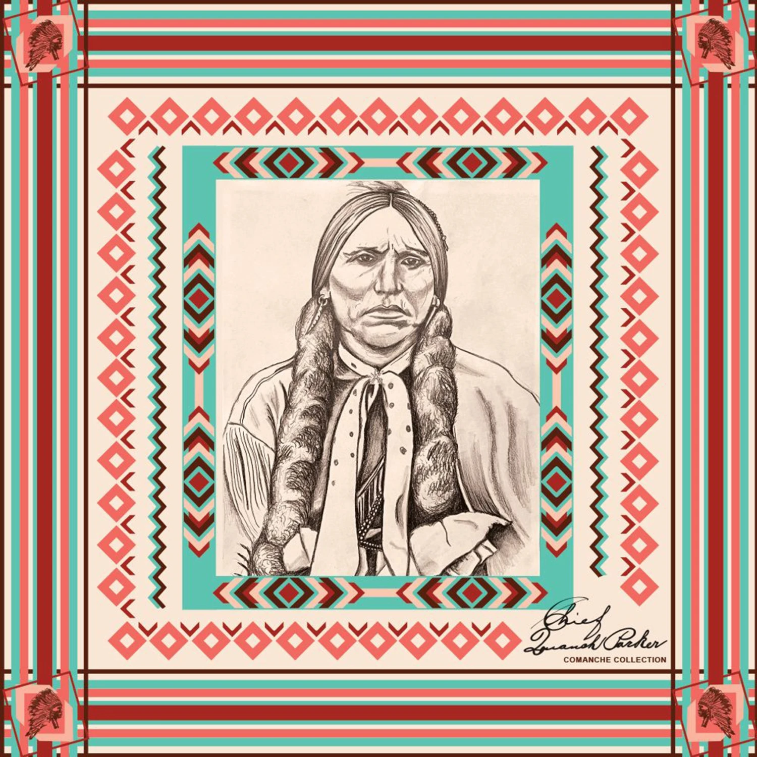 This satin wild rag has beautiful colors of cream, turquoise, pink and maroon. The detailing of Quanah is amazing!