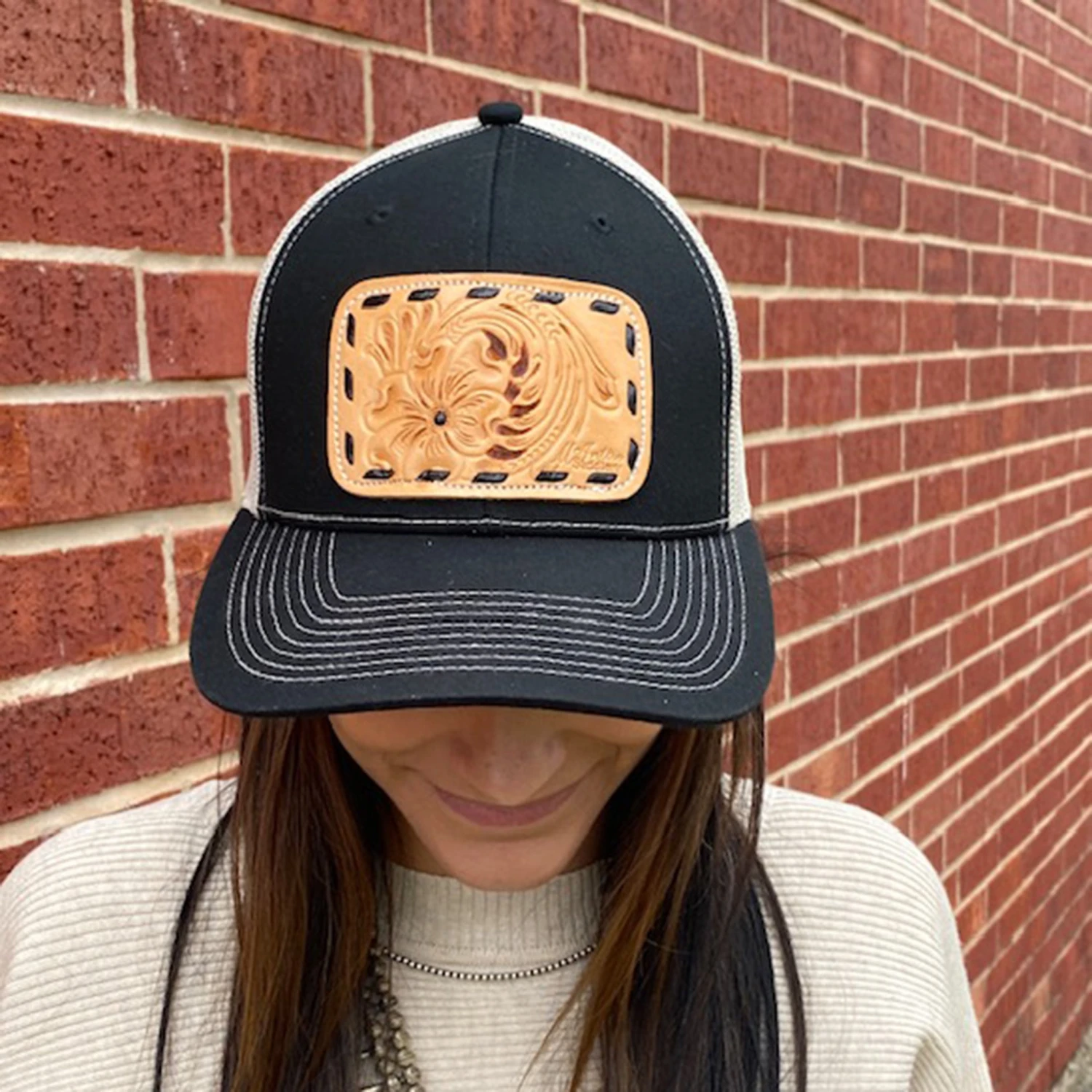 A McIntire Saddlery Original! Add a little Western Flare to any outfit with this Black and Tan Cap. It features a Tooled Leather, buckstitched patch.