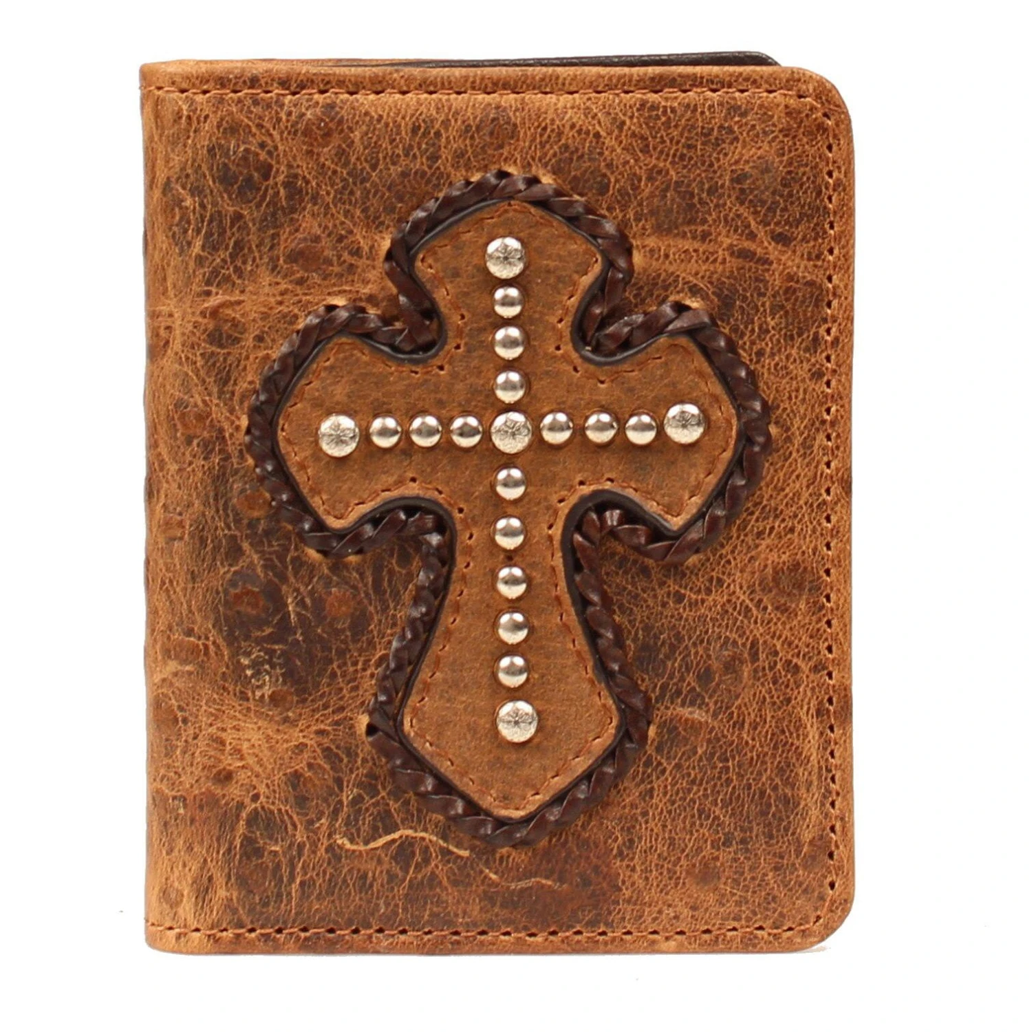 This bi-fold wallet with a cross with brown stitching around the outside of it and studs in the middle it perfect for guys.