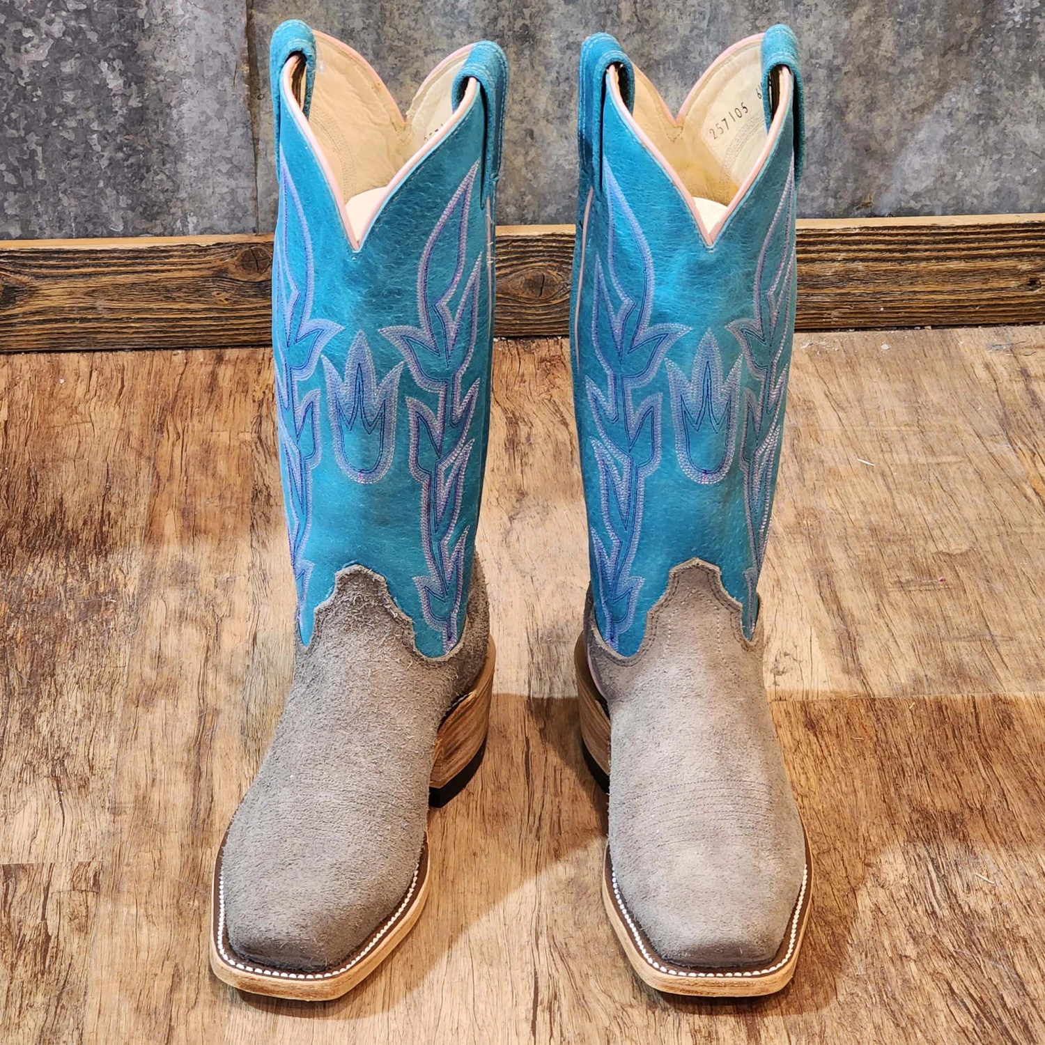 These great looking grey bison boots by Olathe have the style and comfort to keep you going all day long in the arena or at the office. We just love the contrast of the turquoise boot tops with the rough out grey bison.