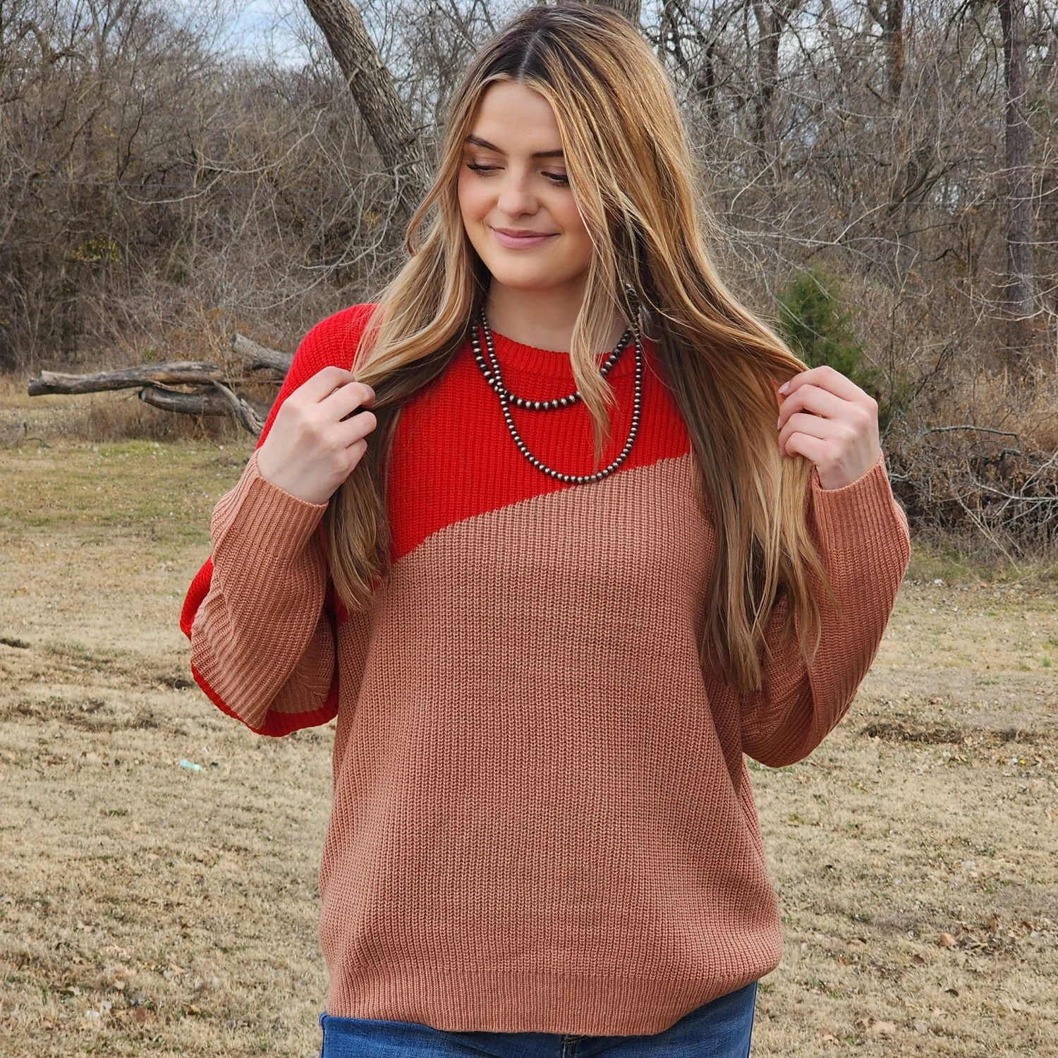 This red & tan sweater is so unique. Dress this up with a great pair of jeans, your favorite boots and stunning jewelry and you will be looking fabulous.