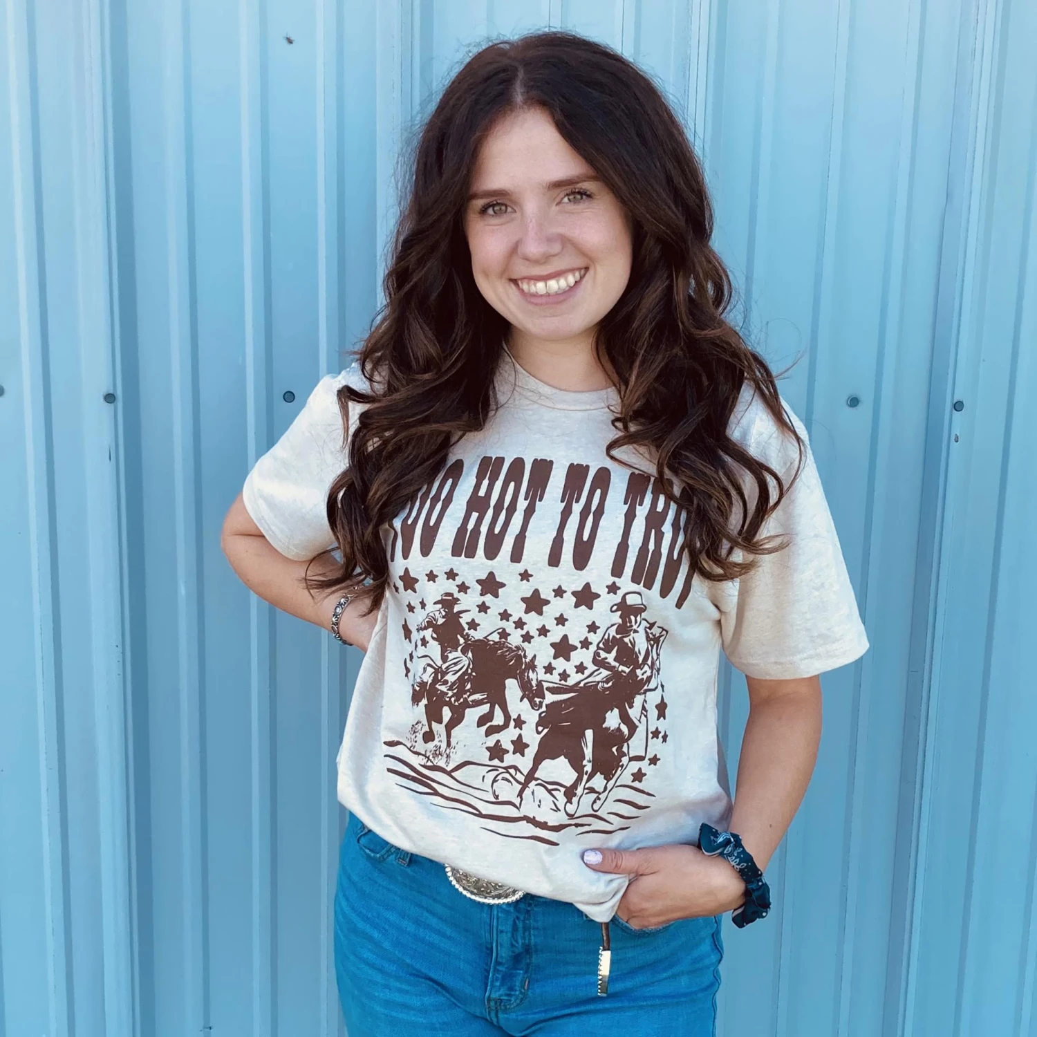 Lets be honest, sometimes were all a little too hot to trot! This fun graphic tee features a cowboy dallied on to a bucking bronc, with brown stars in the background.
