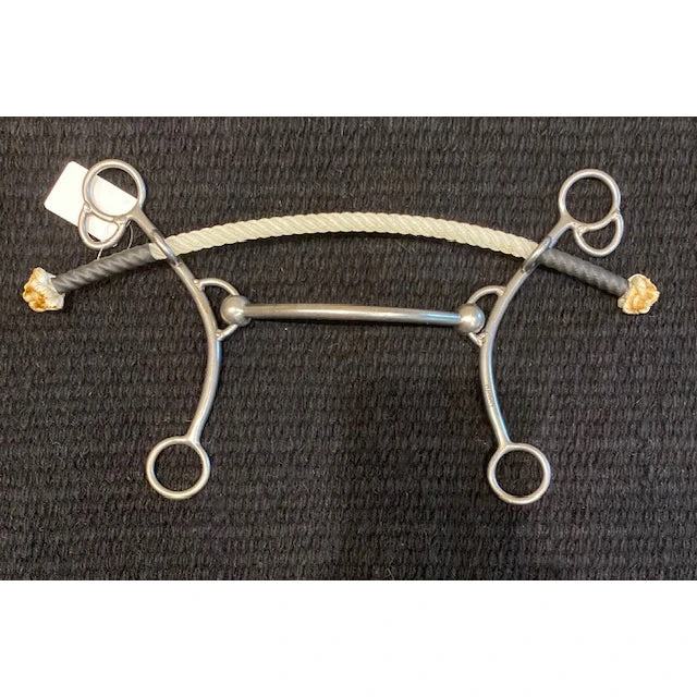 Handmade by Troy Flaharty, this combination bit offers a great weight and feel. This bit has the same shank as the Big Betty only with a rope nose band. This particular bit has a mullen mouthpiece and a rope nose band.