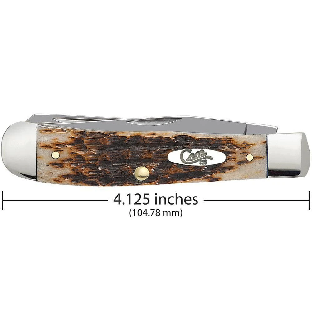 This Case Trapper is a part of the Amber Bone Family. Our Amber Bone color and Peach Seed jig are signatures of the Case brand and the true heart of the case line. It is a jack knife with two full length blades; a slender Clip and a long Spey. The Clip blade is commonly used as a multi-purpose blade and preferred for detail work while the Spey blade is commonly used as an all-purpose utility blade. This knife is constructed with Case Tru-Sharp™ stainless steel which is a special high-carbon steel that helps the blades hold an edge longer than conventional steel. It also offers extraordinary blade strength and corrosion resistance. Comes conveniently packaged in a box. Made in Bradford, PA, USA from domestic and imported materials.