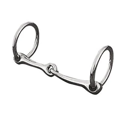 This nickel plated/malleable iron pony ring snaffle bit from Weaver, has a 4-1/4″ mouth and 2″ rings.