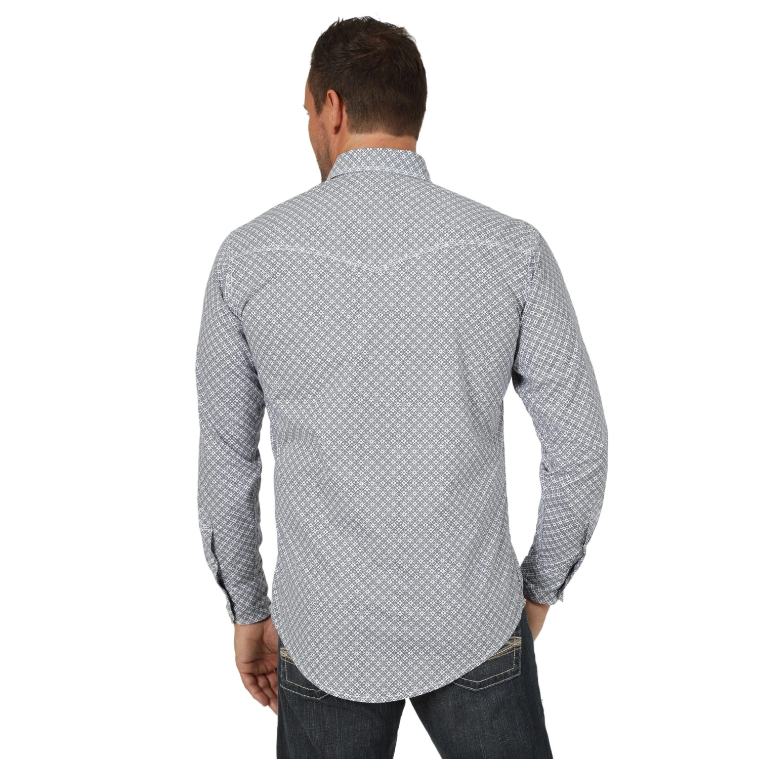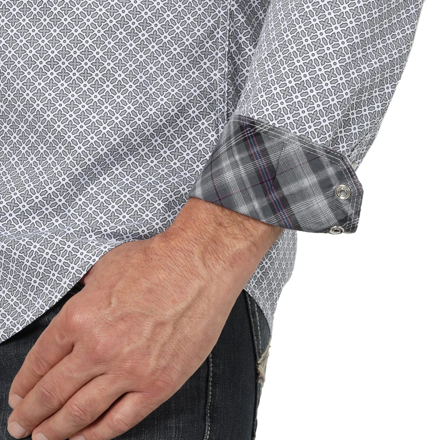 This men’s long sleeve shirt from Wrangler features a grey and white small cross design throughout! The cuffs have a contrasting plaid detail. White button closures run through the center, on the cuffs, and on each chest pocket!