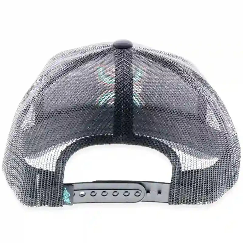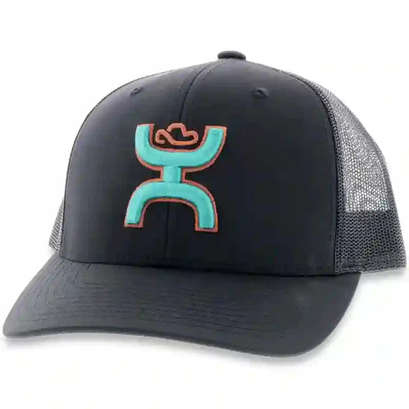 This YOUTH black cap comes with grey mesh back panels for ventilation. There is a grey adjustable youth backstrap for proper fit with a turquoise Hooey tag. Available in a mid-profile 6-panel body with a curved bill. The turquoise puffed embroidery Hooey Up patch is accented in orange. Made with upgraded Odessa Fabric, this cap will resist sweat rings and moisture that always attracts arena dust.
